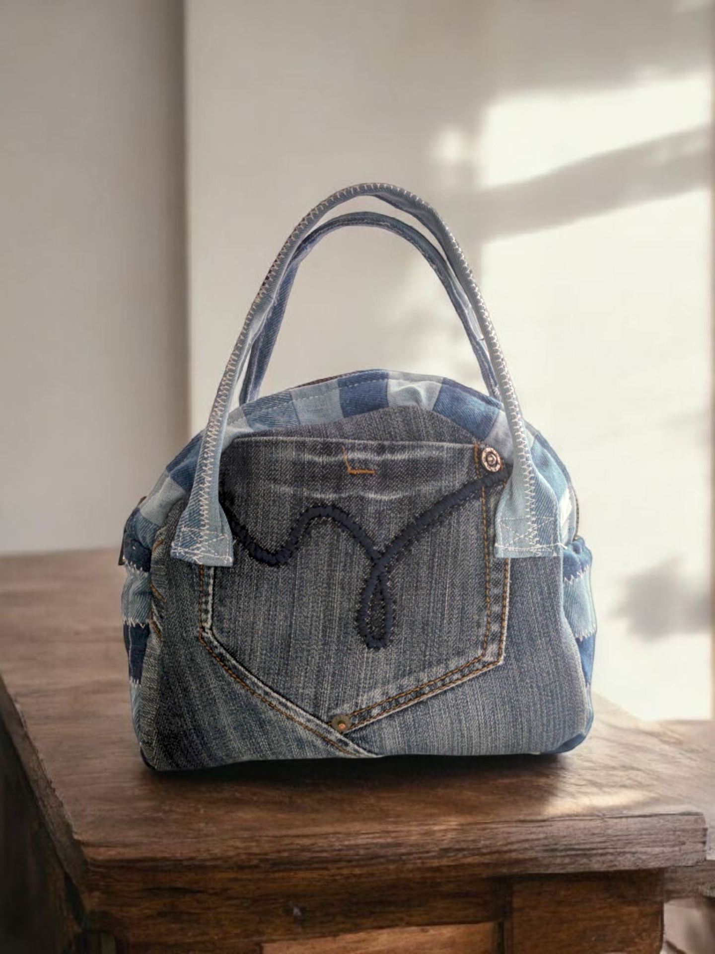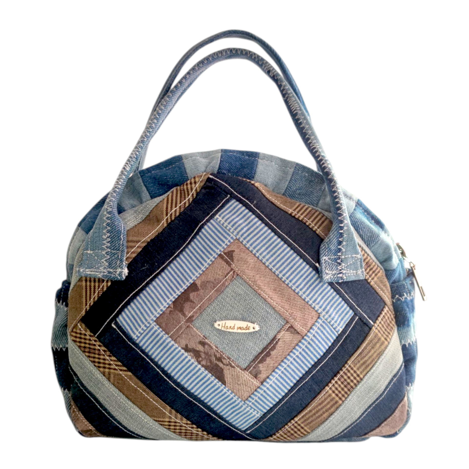 Această geantă unicat este realizată manual din materiale textile (denim), îmbinate cu grijă într-un model geometric cu accente rustice și moderne. Piesele de material – în nuanțe de albastru, bej și maro – formează un motiv central în formă de diamant, ce adaugă profunzime și personalitate fiecărei ținute.