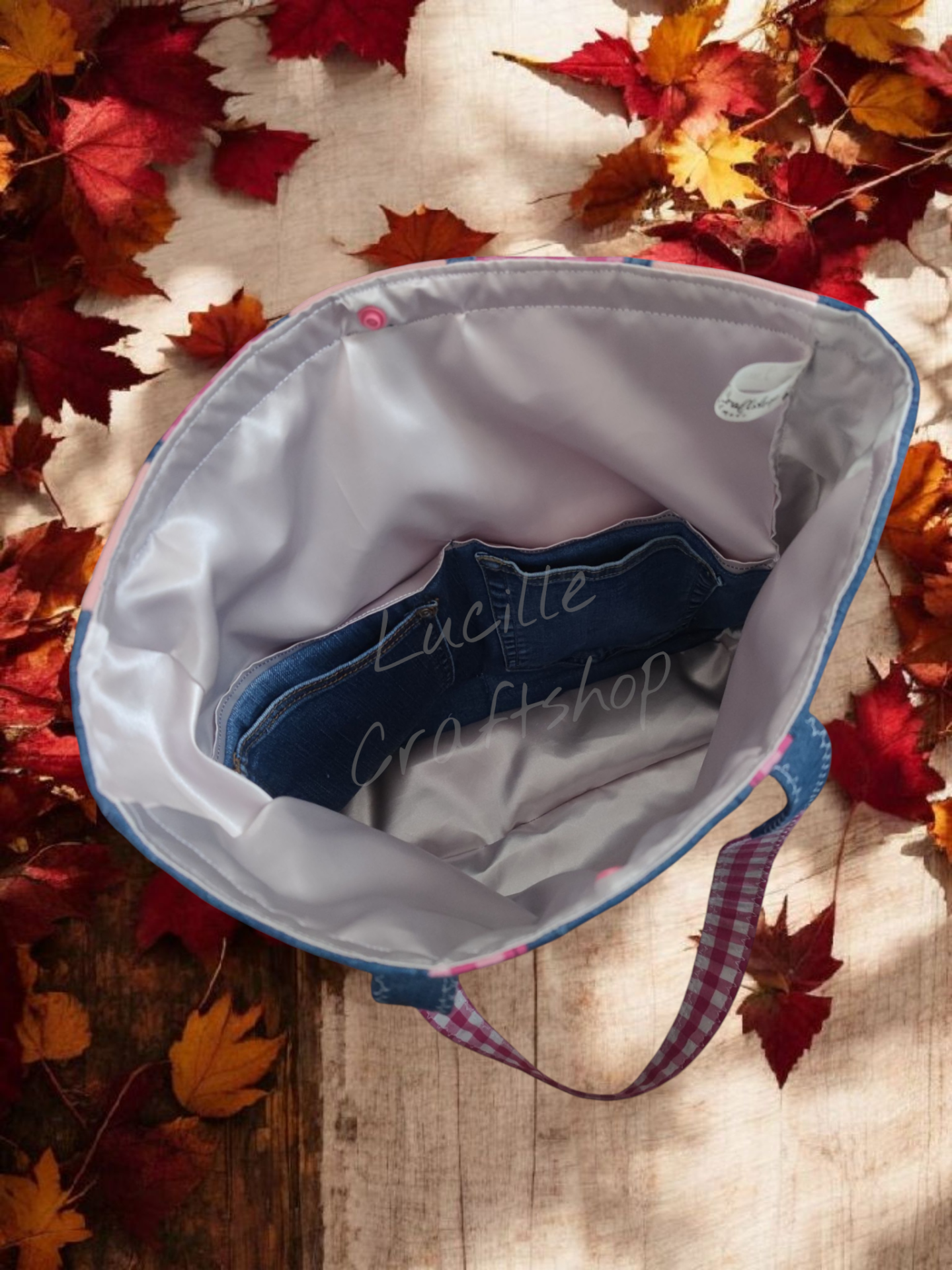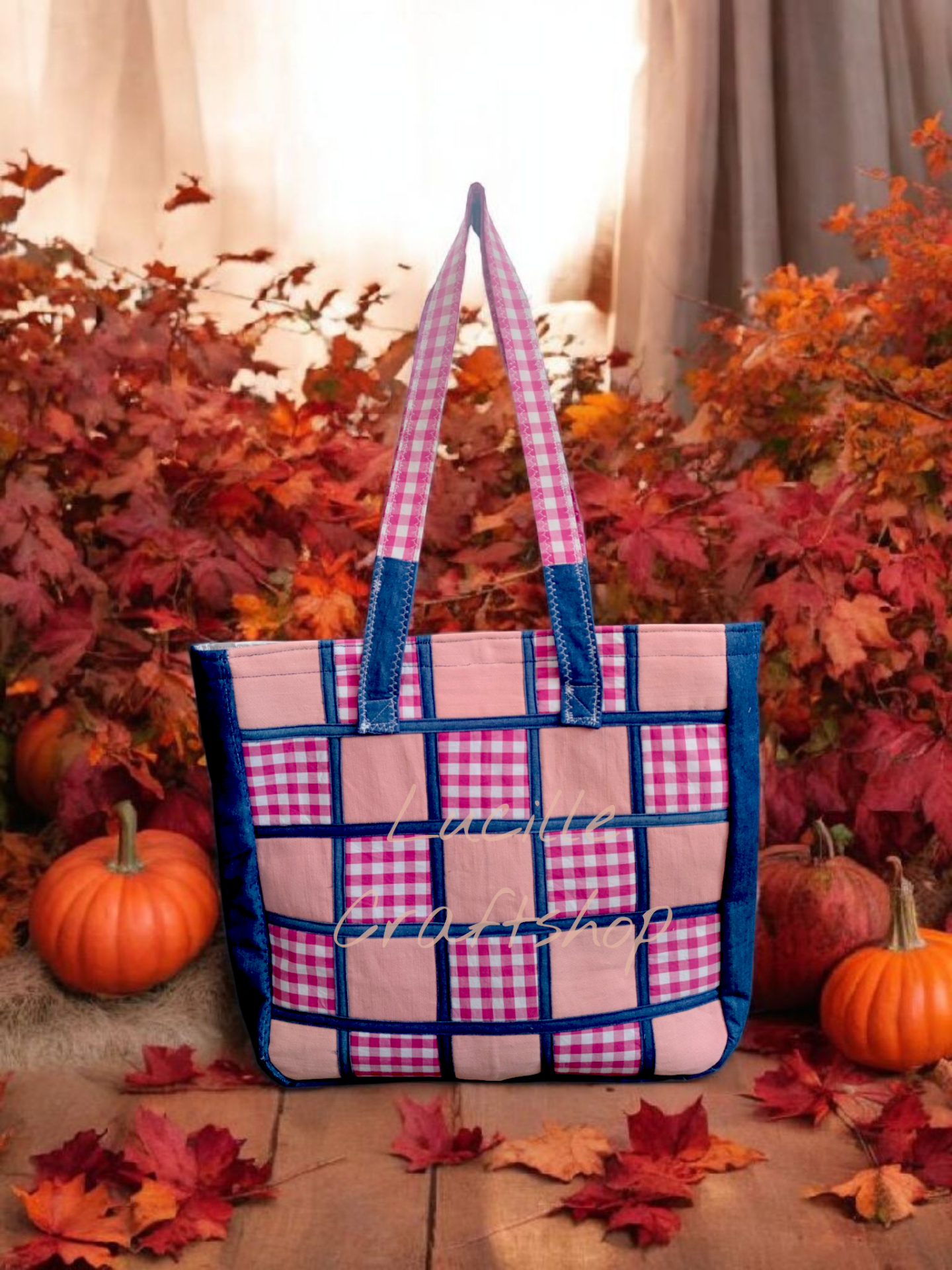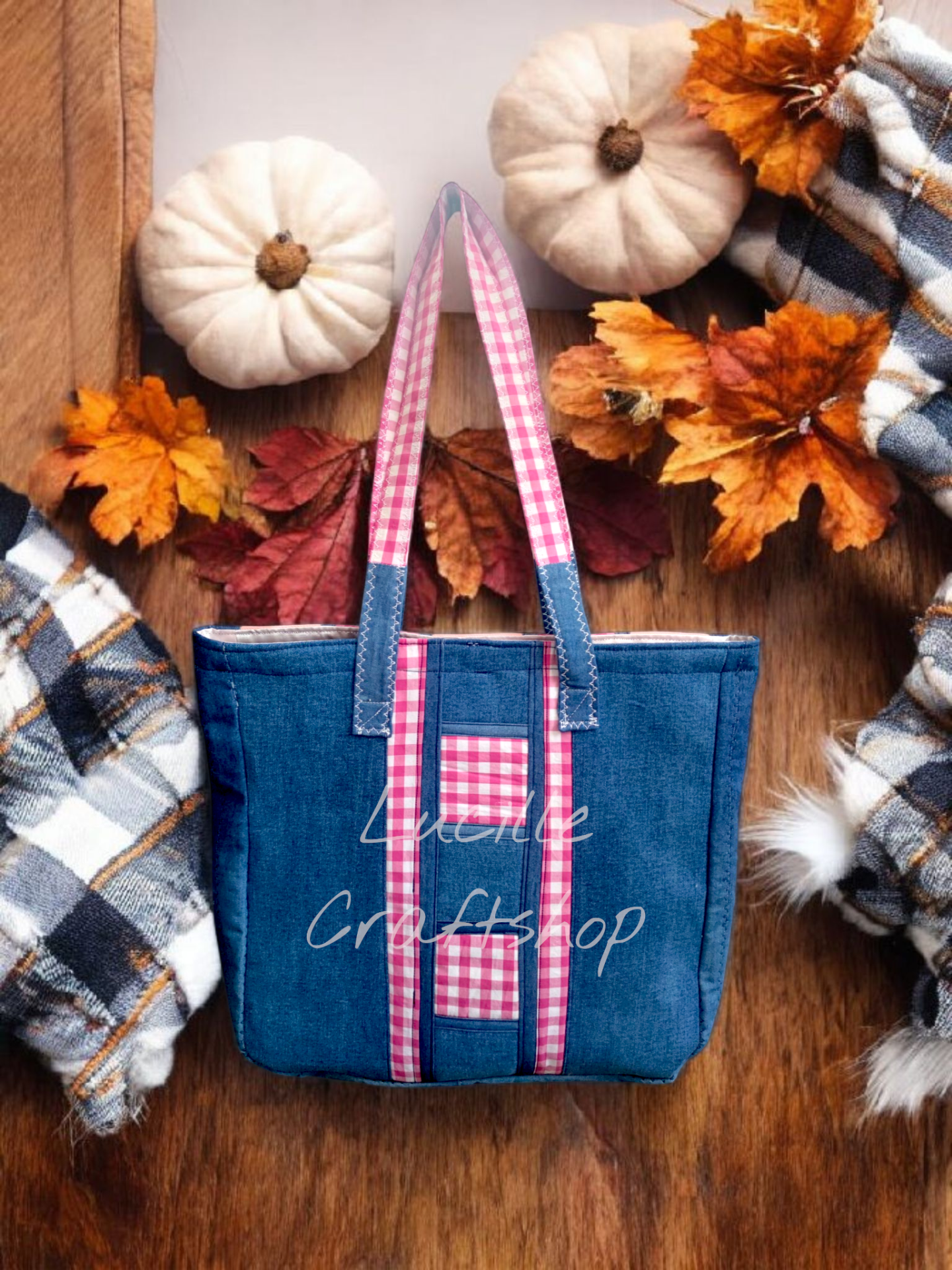 O geantă practică și stilată, realizată manual din denim rezistent, cu detalii din bumbac în carouri roz-alb pentru un contrast plin de personalitate. Designul este inspirat de atmosfera cozy de toamnă, dar versatilitatea ei o face potrivită pentru orice sezon.