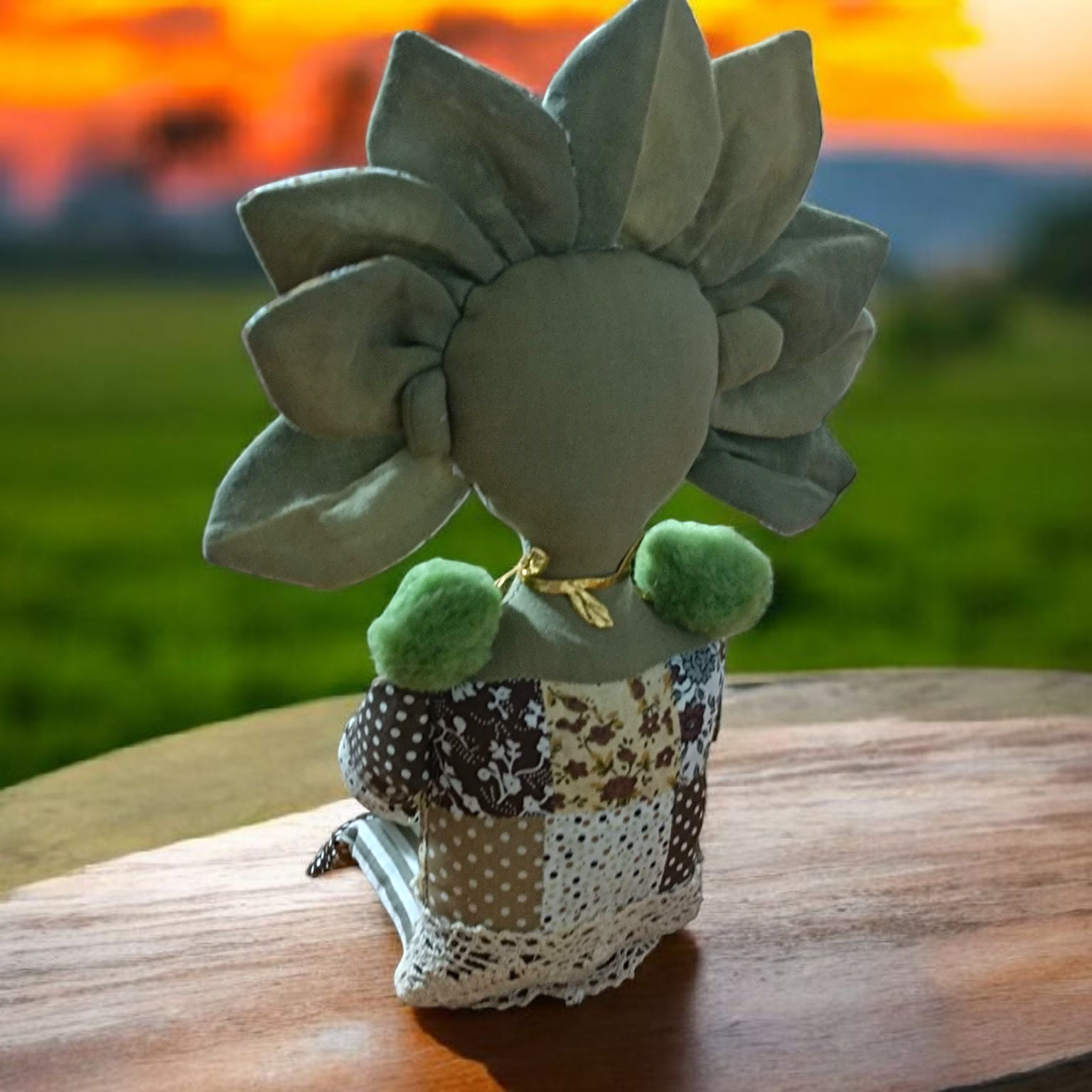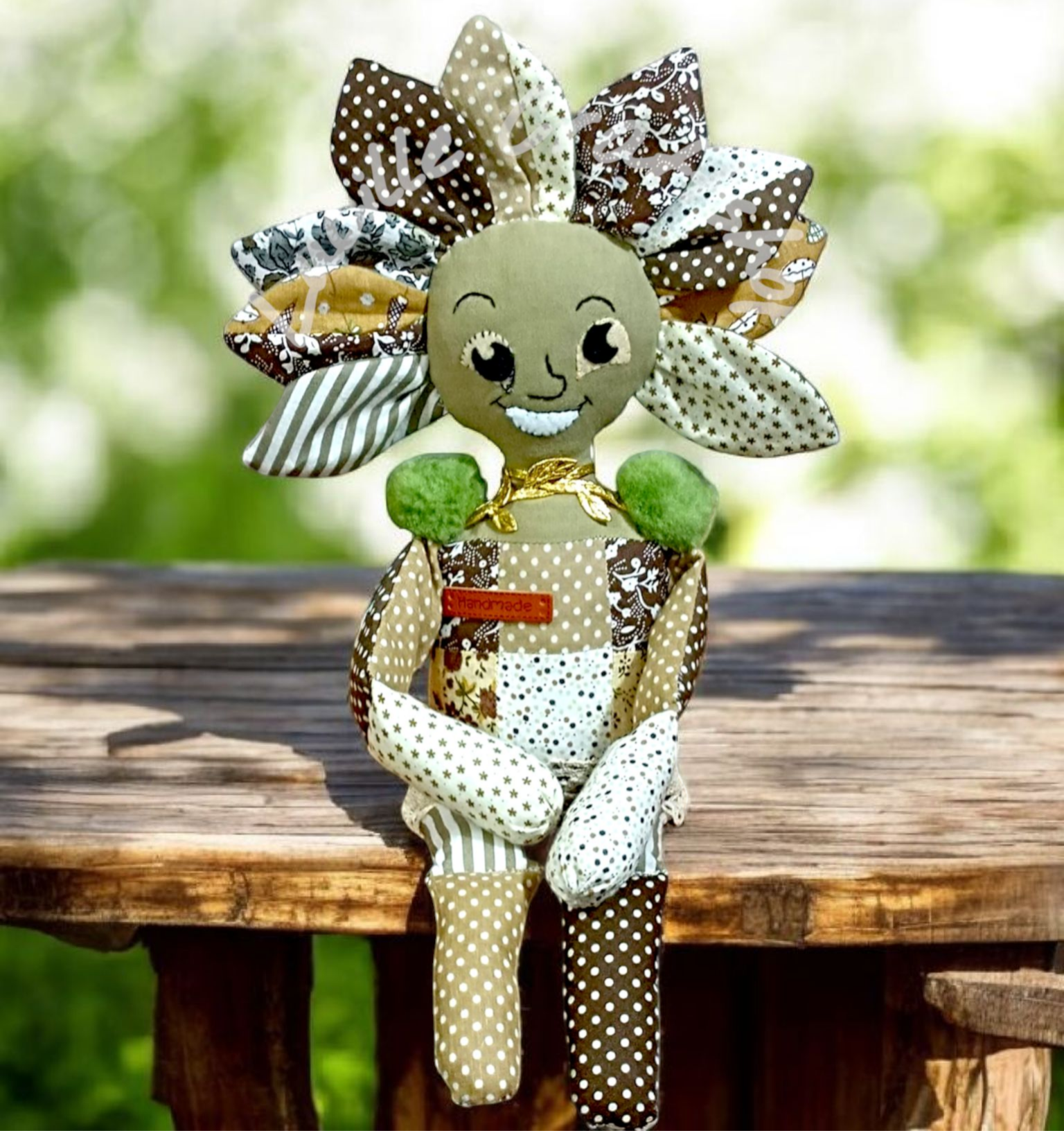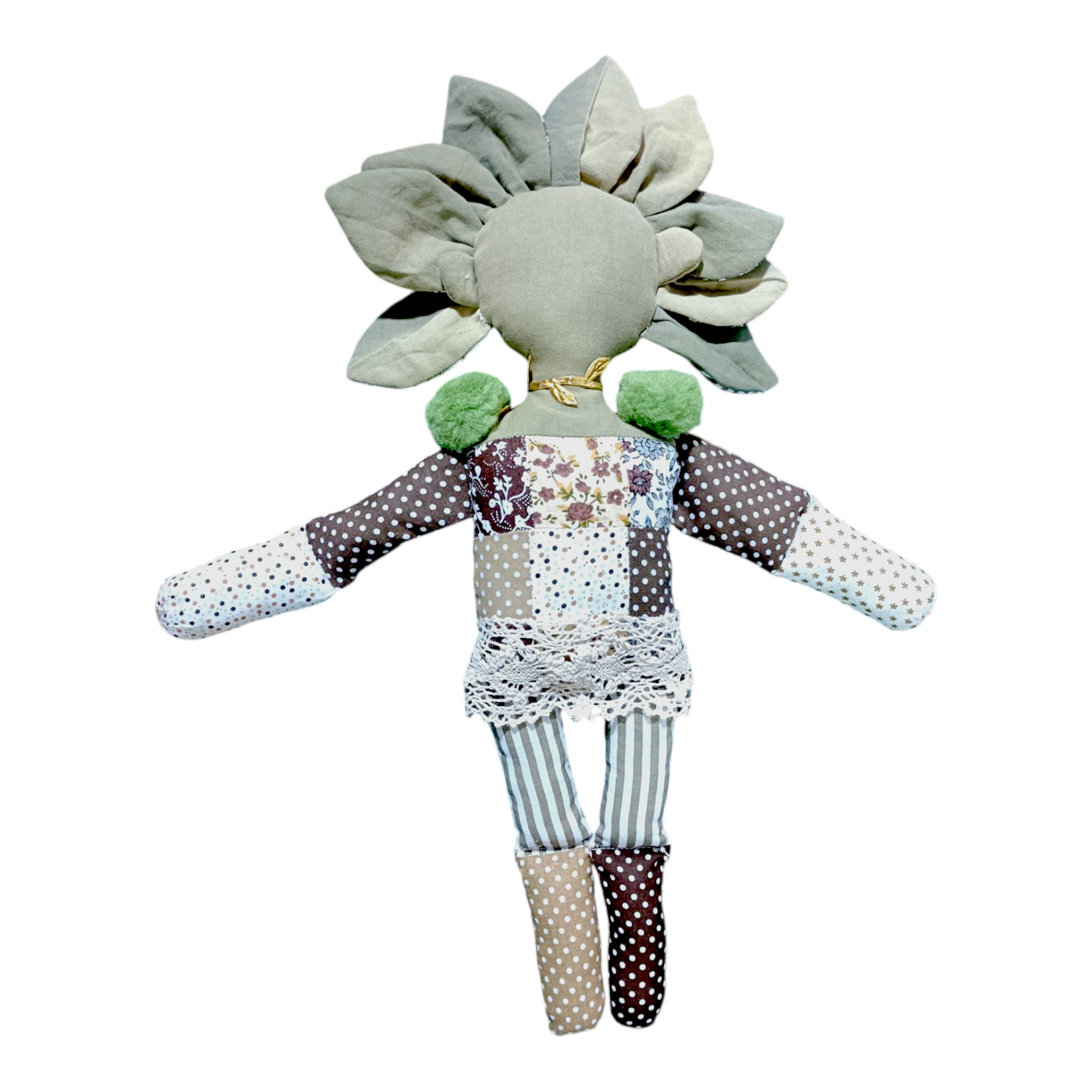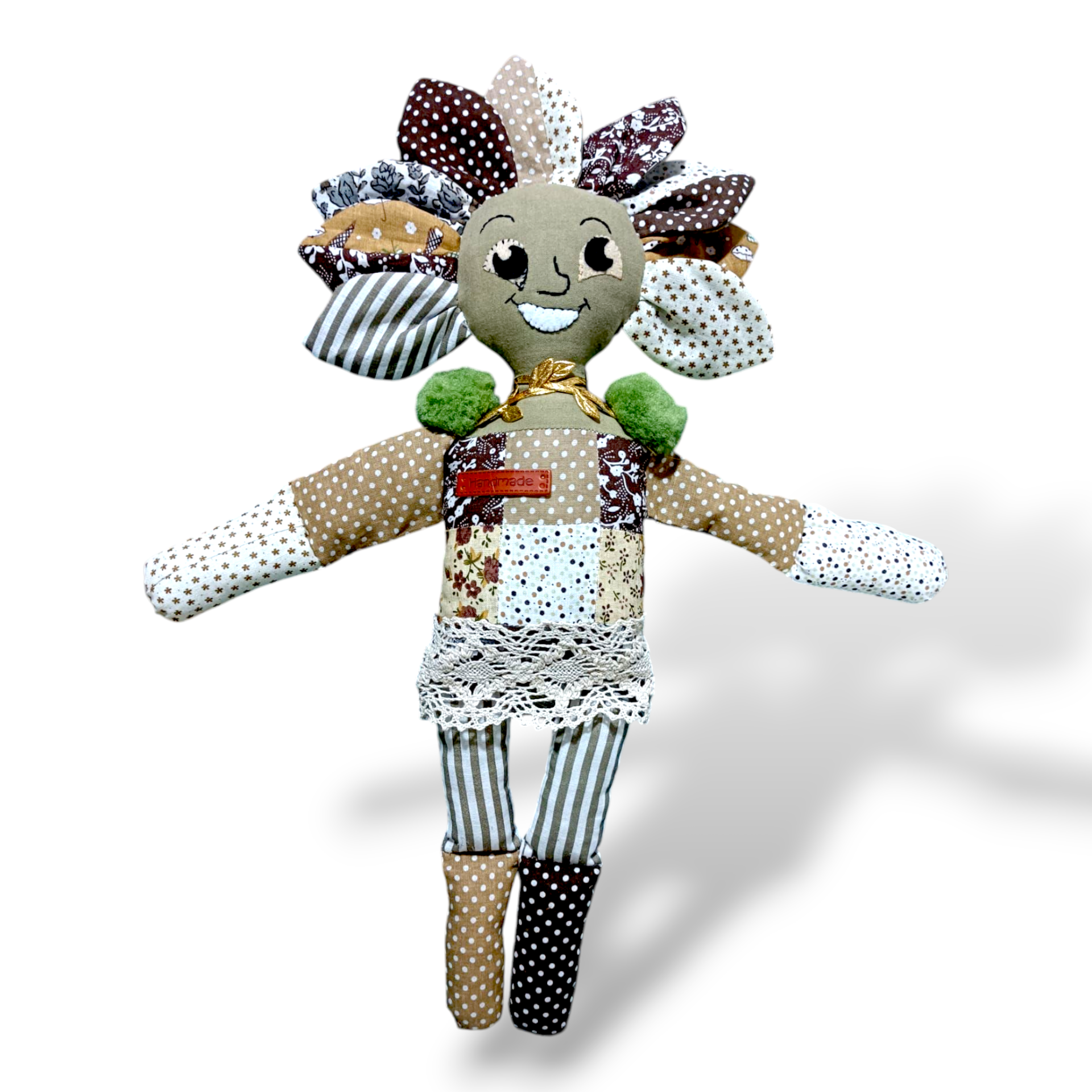 O creație unică, plină de farmec și personalitate, această păpușă handmade aduce natura în sufletul casei tale. Cu o înălțime de aproximativ 40 cm, este realizată din materiale textile atent alese, cu detalii florale și accente jucăușe.